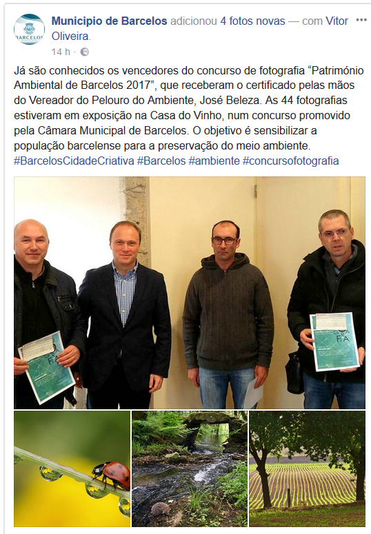 O Vítor recebeu um prémio do Município de Barcelos no concurso de fotografia “Património Ambiental de Barcelos 2017”, pelas mãos do Vereador do Pelouro do Ambiente, José Beleza.